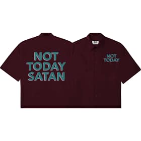 Add fearless attitude to your look with our Not Today Satan oversized half sleeve t-shirt in Maroon. Featuring bold teal typography with a pink shadow, this design makes a strong statement with a stylish twist. The maroon base adds depth and uniqueness, making the colors stand out even more.