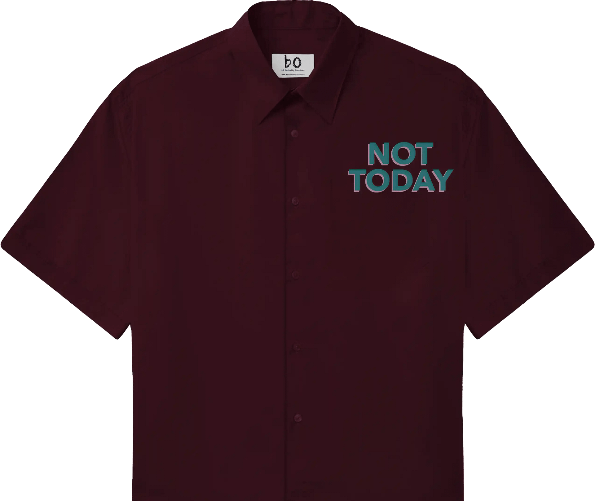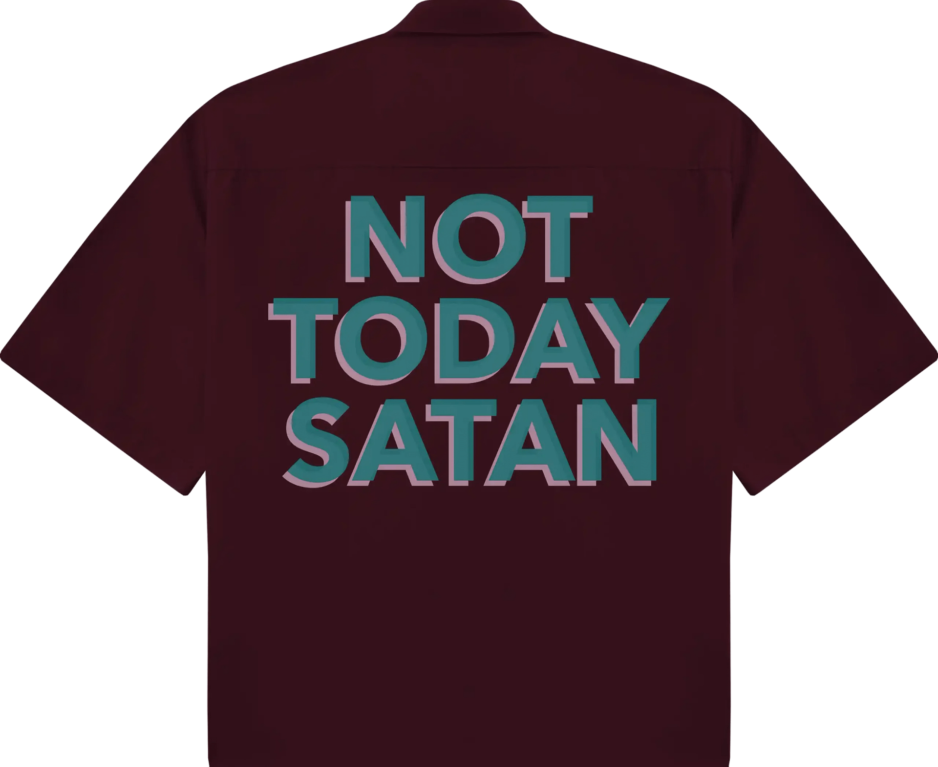 Add fearless attitude to your look with our Not Today Satan oversized half sleeve t-shirt in Maroon. Featuring bold teal typography with a pink shadow, this design makes a strong statement with a stylish twist. The maroon base adds depth and uniqueness, making the colors stand out even more.