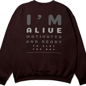 Fuel your confidence with this oversized black sweatshirt featuring the empowering quote “I’M ALIVE, MOTIVATED AND READY TO SLAY THE DAY.” Made from a premium cotton blend, this sweatshirt delivers unmatched comfort with a modern oversized fit. Whether you’re heading to the gym, a casual outing, or just want to stay cozy while looking stylish, this piece is a statement of motivation and strength. Designed for those who wake up ready to conquer.