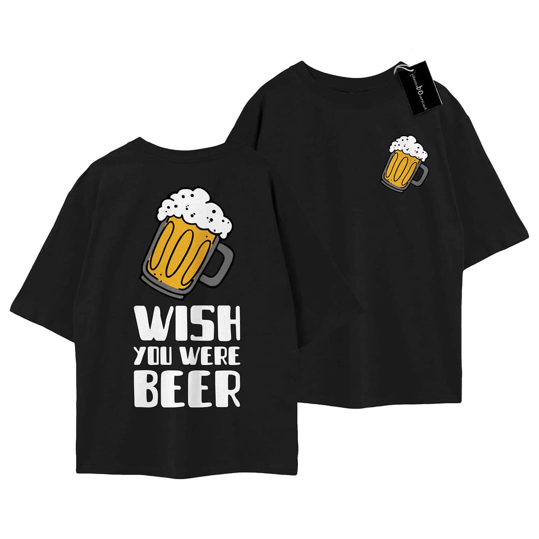 Serve up sarcasm and style with this oversized black tee featuring a bold “Wish You Were Beer” graphic . With a golden beer mug and bright white lettering, this design is a fun choice for anyone who loves beer, banter, or bar nights. Made from breathable cotton, it’s your go-to tee for hangouts, parties, or just chillin’ in your comfort zone.
